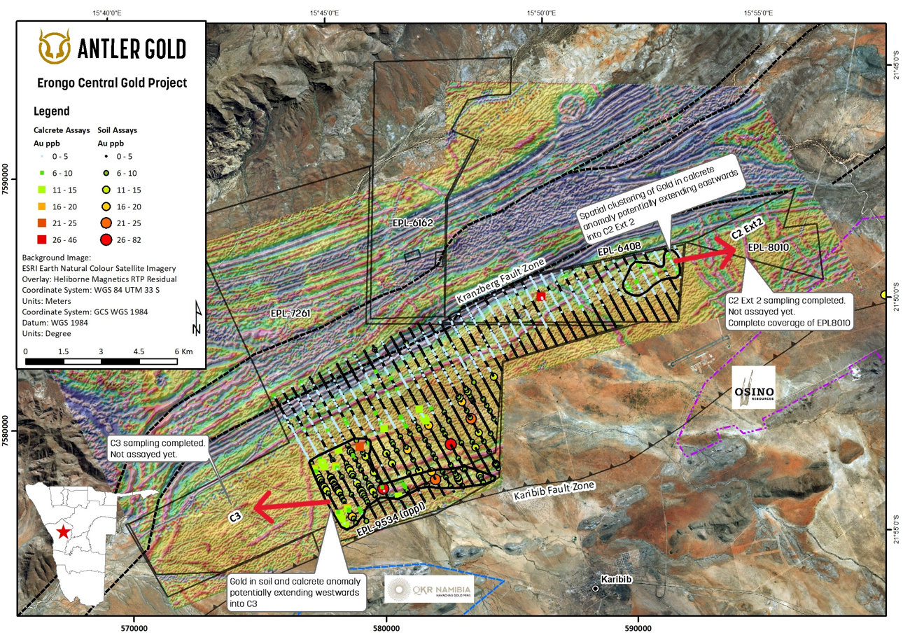 - Target C2 S is an ~7 km long Au in soil anomaly situated SW of Twin Hills deposit (3.2 Moz) within the same synclinal rock package (Kuiseb Formation) and sharing structural similarities