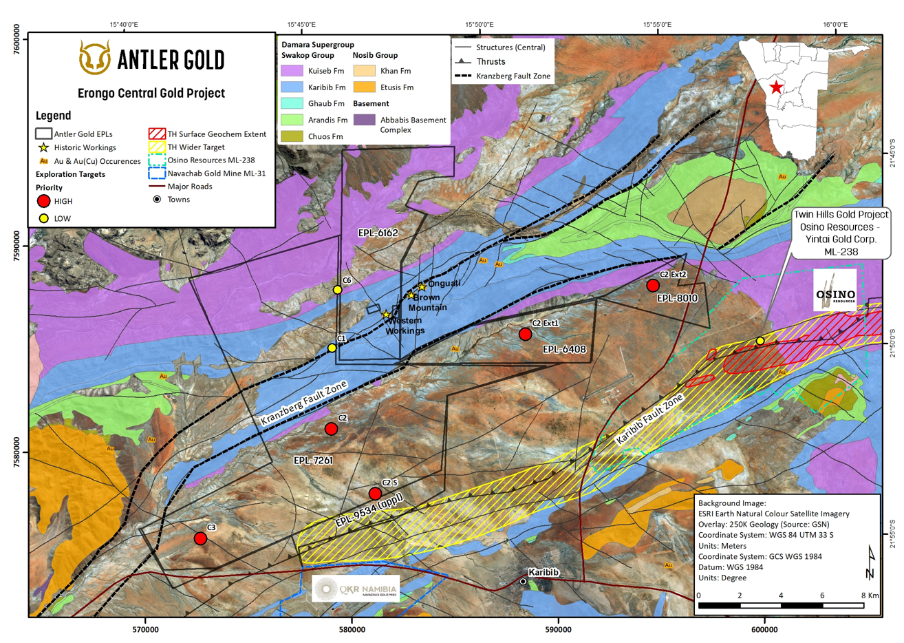 - Overlies similar lithologies and structures as the known Namibian Gold mines (QKR’s Navachab) as well as Osino Resources’ recent Twin Hills discovery (±3.2 Moz Au)